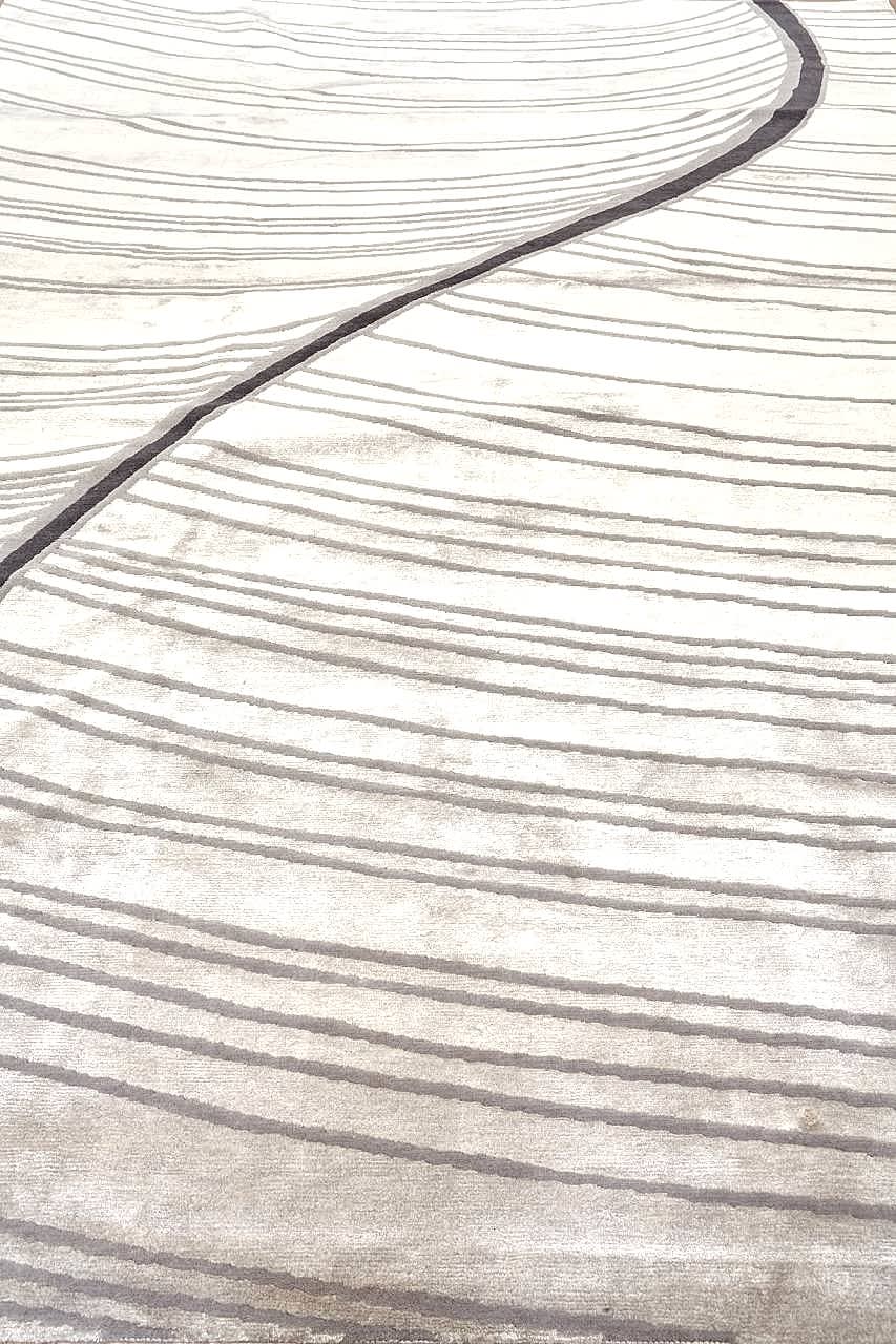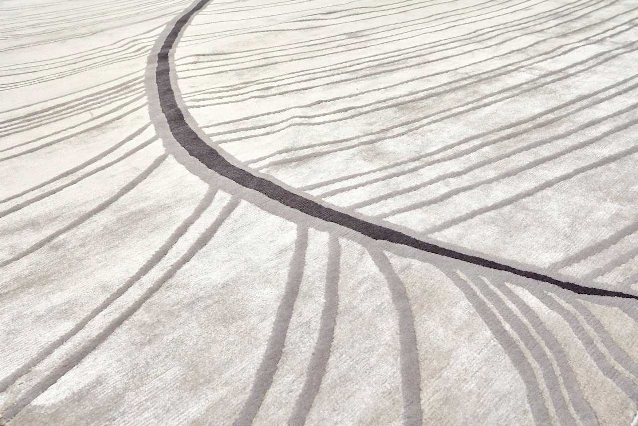 Светлый фон ковра, выполненный в едва уловимых оттенках белого и бежевого, придает работе воздушность и ощущение бескрайности, не нарушая при этом общей гармонии. Эффект можно сравнить с легким дуновением ветра или плавным движением воды, приносящим ощущение спокойствия и расслабления.